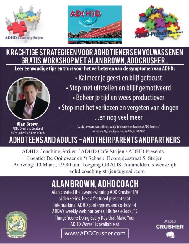 Voor tieners, adolescenten, hun ouders en alle volwassenen met ADHD geeft Alan Brown zijn workshop ADD Crusher. Zijn workshops richten zich op praktische en makkelijk toepasbare manieren om met ADHD om te gaan. Alan is speciaal voor het eerste ADHDvrouw congres uit Amerika overgekomen. “Vrouwen met ADHD verdienen meer aandacht!” aldus Brown. Naast zijn workshop en lezing op het ADHDvrouw congres op 7 maart in Utrecht, zal hij in Amsterdam, de Bilt en ook Strijen zijn workshop geven. In Strijen is de workshop van Alan Brown op dinsdag 10 maart te volgen. Daarna reist hij door naar Engeland.